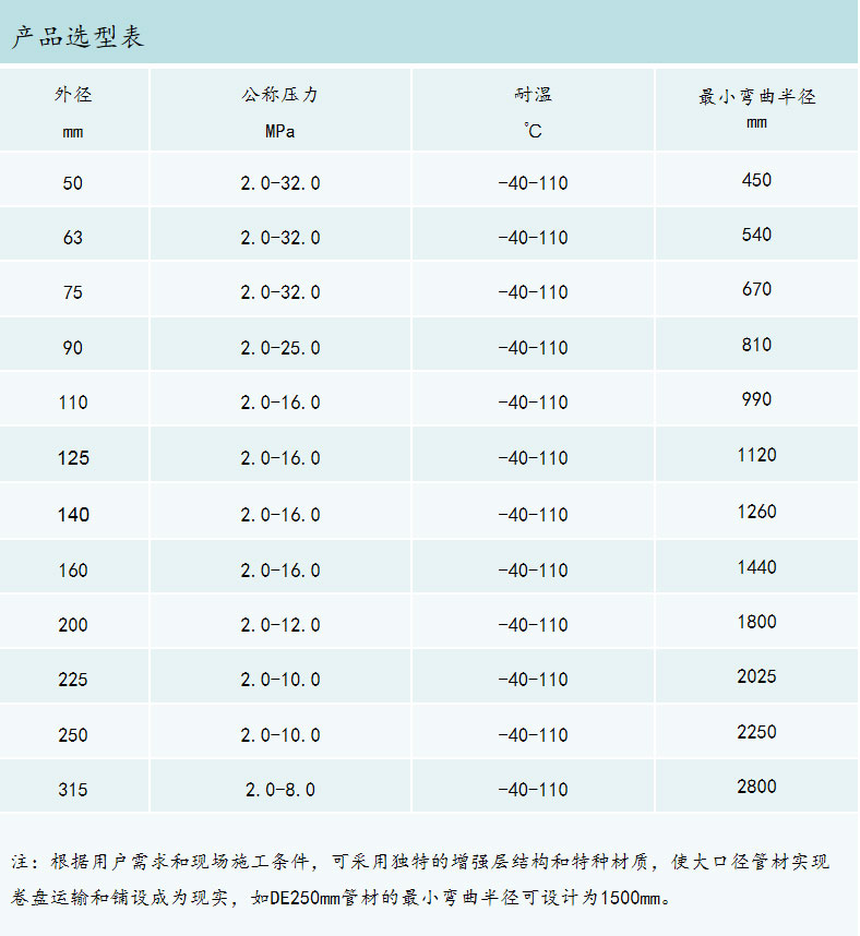 1、內(nèi)芯管:混煉擠出成型,根據(jù)不同礦化度/不同化學(xué)成分/不同輸送溫度的流體介質(zhì),科學(xué)設(shè)計材料配伍,可采用PE/PE-T/PEX/PP-R/PB/PVDF/UHMWPE等